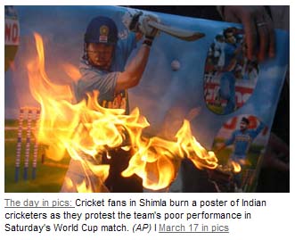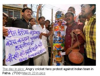New Delhi - Disappointed by India's poor performance against Bangladesh in their opening World Cup cricket championship match in the West Indies, fans staged protests across India on Sunday, news reports said. Underdog Bangladesh won the world championship Group B cricket match in Port of five wickets after bowling out India for a meagre 191 runs in a match that kept Indians awake till early hours Sunday.