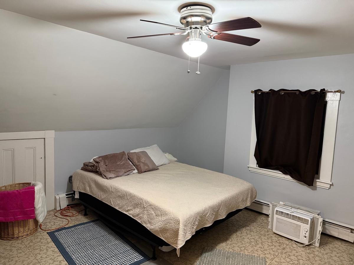 One-bedroom attic apartment for rent in East Somerville, near Sullivan Square Station. The unit includes one bedroom, a small living/dining room, kitchen, and bathroom.