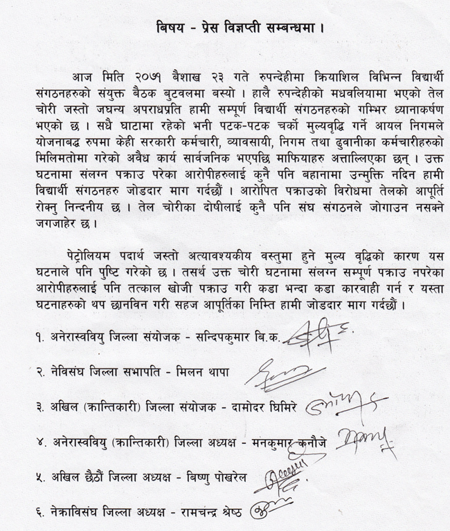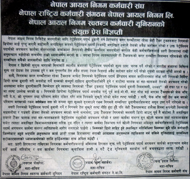 तेल चोरी हुन नदिन खटिएका निगमका कर्मचारीलाई प्रहरीले चोरी अभियोगमा पक्राउ गरेको भन्दै कांग्रेस, एमाले र एमाओवादी निकट कर्मचारी संगठनहरुले मंगलबार दैनिक पत्रिकामा पैसा तिरेर संयुक्त विज्ञप्ति जारी गररेका छन् । उनीहरुले पक्राउ परेका कर्मचारीलाई तत्काल रिहाइ गर्न माग गरेका छन् । नेपाल आयल निगम स्वतन्त्र कर्मचारी यूनियनका महासचिव नवराज पोखरेल, नेपाल राष्ट्रिय कर्मचारी संगठनका महासचिव श्यामकृष्ण महर्जन र नेपाल आयल निगम कर्मचारी संघका महासचिव चन्द्रप्रसाद निरौलाको संयुक्त हस्ताक्षर भएको विज्ञप्तिमा पक्राउ परेका कर्मचारीलाई तत्काल रिहा गर्न माग गरिएको छ ।