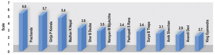Here is the detail for the graph: The Kathmandu-based research group Interdisciplinary Analysts (IDA) has conducted four public opinion surveys since December 2004. This one was conducted between 22 December-13 January among 2,011 respondents in 21 districts. The composition of the respondents is weighted to reflect national figures for caste, ethnicity, and geography. Rate your feelings toward some leaders, 10 being very important, 1 not important, and 5 not particularly important or unimportant.