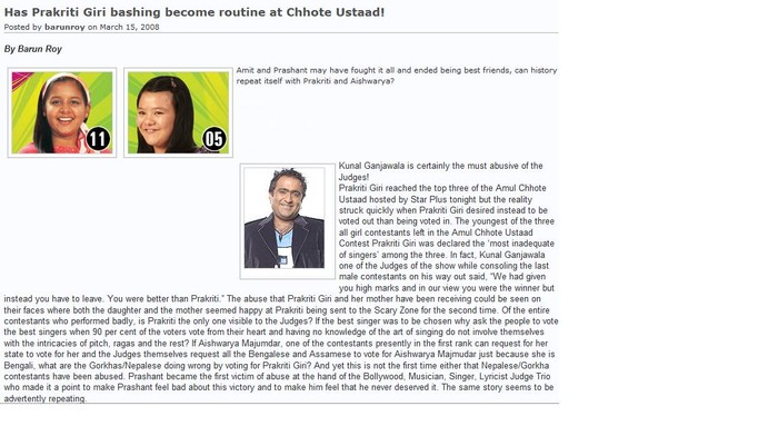 See the cultural fight between India and Nepal on http://beacononline.wordpress.com/2008/03/15/has-prakriti-giri-bashing-become-routine-at-chhote-ustaad/
