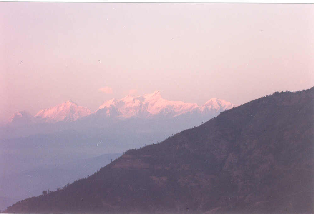 Nice sunset picture of Manslu and Himalchuli. I wonder if you may be able to get it looking nicer though! I suspect that your scanner may have muted the colors a bit (that your print looked much better than the pictures looks onscreen now). You may want to play around with the color balance of your scanned picture a bit to see if changing the contrast/brightness/gamma for any one or all colors might make it look a bit nicer on screen... You may also want to check whether you can scan at higher resolution, or a color setting more optimized for photos. Looking closely at the sky right above the mountain there are these jumps in color between large squares... a problem of the scanning...