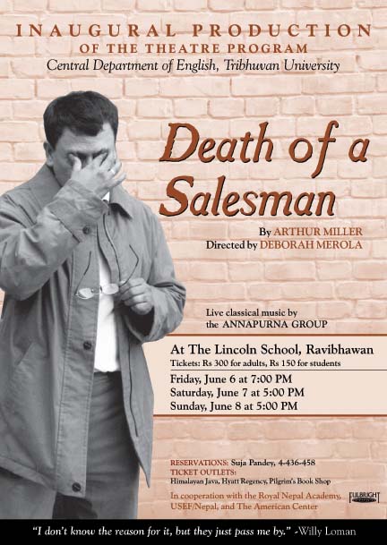 Sajag Rana, an English professor who directed Great Catherine a few years ago, takes the lead role of Willy Loman. Until now the teaching of drama at TU was so literature orientated that it was kind of incomplete, Rana comments, Student could not experience actual theatre production first hand--an involvement in acting, directing, dramaturgy, and design. Now it will be a holistic approach to the teaching of drama. The creative collaboration also includes the Royal Nepal Academy, which is offering design and technical expertise for the production, and will join some TU drama classes. Hari Bahadur Thapa, Joint Director of the Drama Section, and Professors Streedhar Lohani and Padma P. Devkota hope that an ongoing partnership will develop from the project expressing the educational goals of both the non-profit Academy and the University. Streedhar Lohani explained it to the curious teachers/students on that first day, We will be learning about theatre by doing theatre. The performance of Death of a Salesman in Kathmandu is turning into quite an occasion. Students from the Lincoln School where the play is performing are invited into the final dress rehearsal, with a chance for talk back with the cast. And the U.S. Embassy is offering crucial support. Deborah was so thrilled with the note from Constance Colding Jones, Director of the American Center, that she read her words out loud to me: We'd be delighted to sponsor such a visible local event featuring American culture. Three young American graduates of the BA Theatre Program at Hartwick College will volunteer their time helping their Nepali peers make theatre. Tim Browne and Sharad Thakur are working as dramaturges for the lobby display and program. Tim notes, We want to present a brief performance history of this famous American play, but also discuss the choice to use an overlay of Nepali culture in the setting, costumes, and even short sections in the Nepali language when the characters are being particularly familiar or tender. And we want to interview the Nepali actors on their experience of this new dramatic process. Now headed into our fifth month here, I am astounded by the work that Deb has taken on. Besides presenting a play developed in experimental workshop setting, she is also teaching an Introductory Acting course, lecturing on American drama at TUs Kirtipur campus, and leading a seminar on Contemporary American Drama and Theatre. The seminar members are currently discussing David Mamets controversial play, Oleanna, following an animated discussion of Tony Kushners Pulitzer Prize winning play Angels in America. Dr. Michael Hahn, the Country Programme Adviser of UNAIDS, and a representative of the Blue Diamond group were seminar guests and brought the social issues home to Nepal. I was present in class that day, and while the subject matter of these ultra modern American plays is often a pretty disturbing reflection of our society, their power was also clear. I guess I was expecting the seminar to be overly academic, but instead found the discussion unusually alive--people really discovering facts and feelings about their own and each others culture. The Fulbright is a positive pleasure and a great cross-cultural learning experience, Deborah summed up. In rehearsals, we keep talking about the American Dream and what that might mean more than fifty years later and how that dream might translate to present day Nepal. And while there are no traveling salesman per se in Nepal, and a old refrigerator can signify relative wealth rather than money worries (as is does in the Loman family), and we had to find a substitute for Willy and The Woman kissing on stage (a shared glass of whiskey), still this beautiful play is very sturdy in translation. Deborah went on to consider, There are tensions between husbands and wives, fathers and sons in every culture, even a culture very respectful to the father as head of the household. And more and more, I think, young Nepalese men and women confronted with the traditional expectations of their culture and modern enticements, might find themselves asking, Whose dream is this anyway: My mothers and fathers? An imported American dream? Or my own? They may end up in a quandary like Biff, who says to his brother, I tell ya, Hap, I dont know what the future is. I dont know---what Im supposed to want. There are also plans in the works for a drama workshop for expatriates living in Nepal-- maybe to start things off a staged reading of Thornton Wilders parable for our times The Skin of Our Teeth, as well as an evening of student-directed one-act plays, and an playwriting group, maybe focused on theatrical adaptations of contemporary Nepali short stories and poetry. And while her grant ends at the end of July, Merola plans on returning in September for a three-month extension offered by the Fulbright Commission. I want to do more advanced actor/director training and supervise some senior directors in productions of Nepali/American plays. I also hope to stage an inaugural production on the stage of the Royal Nepal Academy, perhaps a bilingual adaptation of Broughton Colburns well-known book about a Gurung hill woman, Nepali Aama. There is also the exciting possibility of a collaboration with Jirka Kratochvilj, a colleague of mine, who is coming to Kathmandu on an academic sabbatical. Dr. Kratochvilj is a highly respected choral director, who for several years conducted the World Vision Youth Ambassador Chorus, which brought together 50 students from 50 different nations for international tours. While I personally long to go trekking in the mountains and leave the noise and pollution of the Valley, Ill have to wait until Salesman hits the stage. Performances are on Friday, June 6, Saturday June 7, and Sunday June 8 at 5:30 PM at Lincoln School. Ticket prices are 300 rupees for adults, 150 rupees for students. Ive been drafted to help with publicity, so for more information contact Bev Hoffman at 5527694. Se