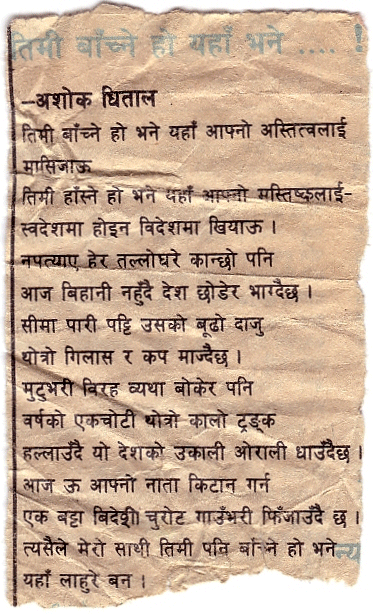 The poem was by Ashok Dhital, as it appears under the title of the poem. Since I was out of country, someone jokingly sent the issue "What about you?". I really liked that last few lines: GyaNeX "आज उ आफ्नो नाता किटान गर्न एक बट्टा चुरोट ... ....."
