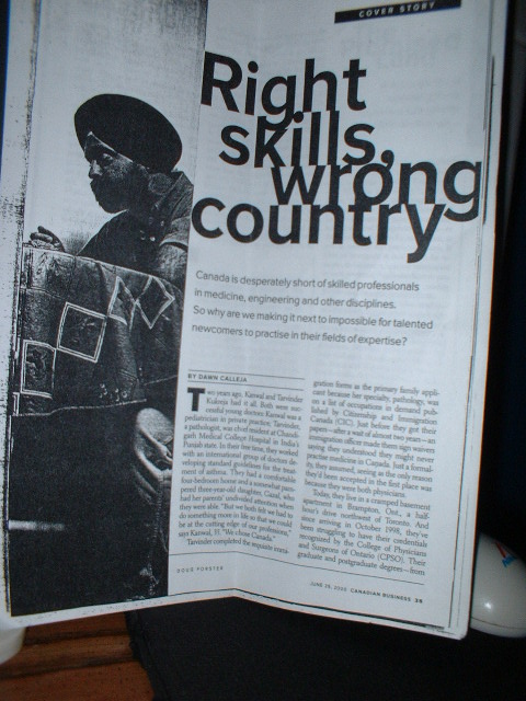 Today, they live in a cramped basement apartment in Brampton, Ont., a half-hour's drive northwest of Toronto. And since arriving in October in 1998, they've been struggling to have their credentials recognized by the college of physicians and surgeons of Ontario (CPSO) Their graduate and post-graduate degrees- from renowned medical schools where they studied in English with doctors from North America, the UK and Australia- so far mean absolutely nothing in Canada. They've spent their entire life's savings on expensive credential assessments (which equated their education to post graduate work at the University of Toronto) and exams. They are now $9000 in debt-and still no closer to getting licensed then they were when they first arrived. But still they have to pay the bills. Between them, they applied for more than 300 jobs, from sofa-maker to home-care worker, in the three months after they first stepped off the plane. Either they were too qualified or not qualified enough. Kanwal initially took a job of security guard for $8 an hour, but quit after only four days. "I put on uniform, but I kept thinking myself,'What am I doing here?" he sighs. Money was so tight that the couple considered applying for welfare. Contd....