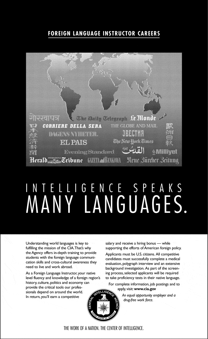.dear friend john doe !! thank you for remembering me..or shall i say reminding me?? yes...there is a conspiracy theory in this advertisement. The united states now wants to learn all the languages in the world because it is not sure which country it will be attacking next. It might as well be nepal !! remember..some american and european firms have published their reports about the findings of oil wells in nepal?? yes..that will definitely motivate mr. bush to launch an attack in nepal. He also has a valid reason for attacking nepal. Maoists are terrorists. And one of the things that the constituition of america says first is to wipe out terrorism. So be prepared. also...coming to the main point. The main reason why american government is so eager to learn different world languages is that they have learnt a lesson from japan in the second world war. American attack in Japan and towards japan's allies was very successful because of one and only thing- an unknown language to the japanese. Yes my friend. The native american language of "navajo" pronounced as "navaho". american soldiers and commanders were relaying messages in navajo language and japanese troops could not decode the messages. so apparently the united states had an upper-hand in the war since the beginning. united states doesn't want to be in the position of japan....so it is eager to learn all the languages of the world so that america may not have to suffer like japan in the second world war. the bottom line: this is all politics my friend. god bless us ( i'm not saying the US)