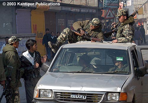 What do I see here? I see that a frightened, and already subdued young student, probably in his teenage, being kicked by a rifle wielding jawaan. The student is frail, small, while all other jawaans are strong and can control him easily. The driver of the Isuzu truck seems to be unbothered and focussing on his steering, while his companion watches the kick approvingly. The man who is on the top of the truck is also watching approvingly while his companion delivers the kick.The jawaan on his feet on the road is acting like a brace, making sure that the student couldn't eschew the kick. Do I see something wrong? Principally, it is wrong to use army jawaan to subdue unarmed students in a state where police is supposed to do these jobs. Even then, it is wrong to kick a teenager , most likely in his mouth, such ferociously because the kid is already under the control of these strong army jawaans. Finally, is that rifle MI-16? How about sending this photo to newspapers like New York Times, Chicago Tribune, Baltimore Sun, LA Times, Houston Chronicle? Let Americans see how their assistant is being used in Nepal? As for use of Mi16, an old issue of Nepali Times once said that "One M-16 costs $900: enough to supply all medicine and maintain a VDC dispensary for one year, or immunise 900 children against deadly diseases." |