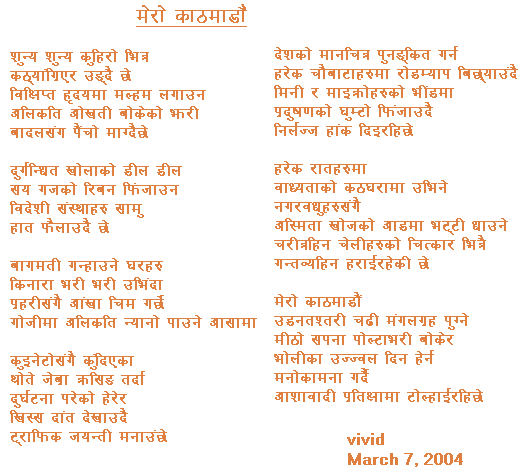 Vivid, You disappeared after Sajha gathering in Kathmandu. Welcome back to Sajha. This thread was badly needing women's perspective. Your's is a wonderful start. Before I share mine, I couldn't wait to type your poem in devnagari for easy reading of Sajha readers. So fitting, so telling !