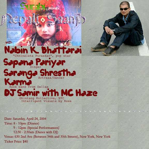 "Surahi" Presents NEPALI SAANJH A Night of Nepali Songs, Dance, Food and DJs With Special Guests Nabin K. Bhattrai Sapana Shree Saranga Shrestha Karma Band Saturday, April 24, 2004 at: 630 Second Avenue (between 34th and 35th Streets) New York, NY 8:00 P.M. - 10:00 P.M. ---- Dinner 9:00 P.M. - 12:00 Midnight --- Special Performances 12:30 A.M. to 2:30 A.M. --- DJ Admission - $40 Come one Come all.