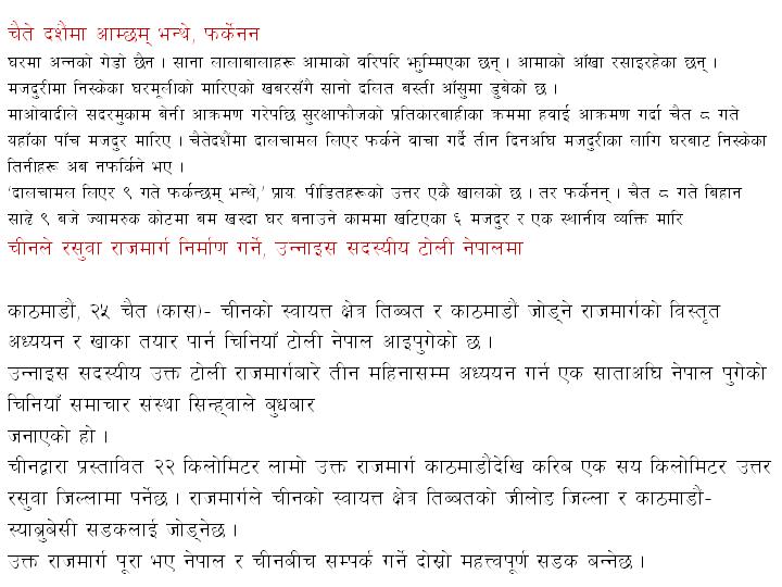 Hey Kalabati, Thank you very much for your postings in Nepali font. These are really amazing news. We had to collect different news papers to read those but you brought all together. You are thankful. |