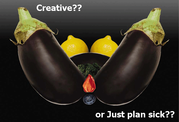 hey thought this thread was dead..hehe anyways since its alive again heres a pic...guys what do u think?? creative...art.....or...well..totally sick kinda humour?? hehe i find it artistic..i mean man when i saw it...it blew me away..never thought about such a thing hehe...so that person who did it..must be one hell of a creative person..;) (ps this is the most discreet among the pics ..that was fwd to me..if someone requests for them..might post more till then hehe..let me know what do u think..:D..) cheers