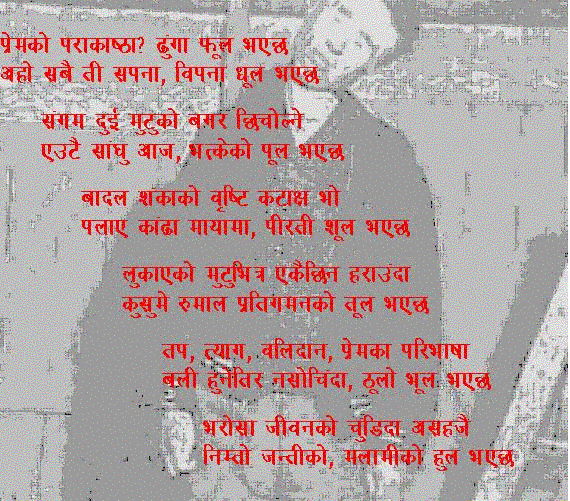 Thunge_ko ta fool_le ho, failadain_cha jahar bistarai bhukampa_ko dhakka napardai, bhatakai_cha sahar bistarai ! ne muddai darta bho kunai, na sunuwai nai mero pakchyako birruddha, vai.sa.ke_cha thahar bistarai! kura milen are bagar sita lahar_ko simana bhitra basna baru, khoj_dai cha nahar bistarai! khel afanai bas_ma parun, jitaoun bazi sabai_ko. chahiye_ko taas ekkai ho, aaundai _cha dahar bistarai ! Open to corrections! |
