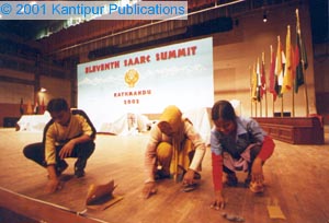 Caption for this picture at kantipuronline reads, "Workers preparing the stage at the capital's Birendra International Convention Center on Monday where the major convention of the upcoming SAARC Summit is slated to take place. The event is being hosted by Nepal from 4-6 January. (Online Photo: Narendra Shrestha)" Looks like "Child labor" to me. Not that I am seeing it for the first time and it won't be the last. And we have accepted them as "workers"... Better than the alternative they have- hunger. But should the journalists or photo-journalists be more aware of different perspectives? Or am I putting political correctness ahead of humanity? (I could, of course, be in error because of insufficient image resolution.)