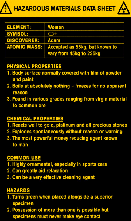 The Geography Of A Woman: Between the ages of 15 and 18, a woman is like China or Iran. Developing at a sizzling rate with a lot of potential, but as yet still not free or open. Between the ages of 18 and 21, a woman is like Africa or Australia. She is half discovered, half wild and naturally beautiful, with bushland around the fertile deltas. Between the ages of 21 and 30, a woman is like America or Japan. Completely discovered, very well developed and open to trade, especially with countries with cash or cars. Between the ages of 30 and 35, she is like India or Spain. Very hot, relaxed and convinced of its own beauty. Between the ages of 35 and 40, a woman is like France or Argentina. She may have been half destroyed during the war, but can still be a warm and desirable place to visit. Between the ages of 40 and 50, she is like Yugoslavia or Iraq. She lost the war and is haunted by past mistakes. Massive reconstruction is now necessary. Between the ages of 50 and 60, she is like Russia or Canada. Very wide, quiet and the borders are practically unpatrolled, but the frigid climate keeps people away. Between the ages of 60 and 70, a woman is like England or Mongolia. With a glorious and all-conquering past, but, alas, no future. After 70, a woman is like Albania or Afghanistan. Everyone knows where it is, but no one wants to go there.
