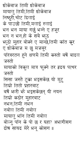 heheh thanks ueta kt n others opss! havent u guys listen to the song oh carol by smokie?its just the same thing we tried to make in nepali yaar!!! well a poeter n writer writes everythings,collecting sad songs to happy themes n that doesnt mean someone betray him/her..well when a writer writes something about emotional,tragedy it gathers more attraction than writing a smiley songs,poems...that's it babe!!! hope u like it...Opss!!!