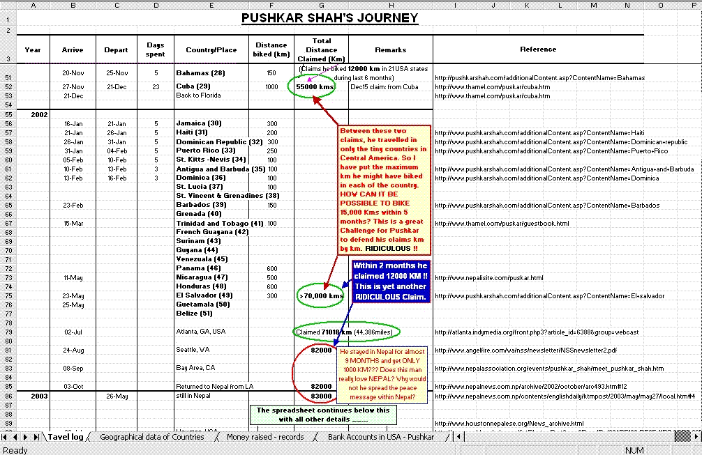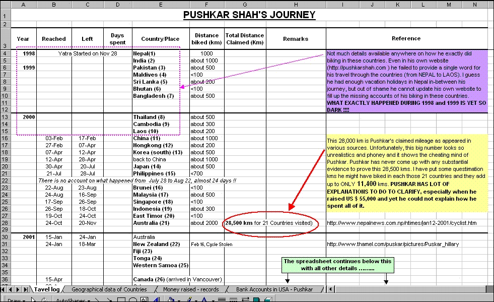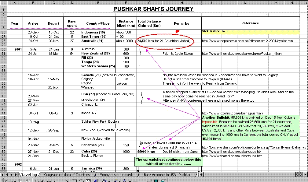 I don't think he has made any money swindling others. He could have been finished long-time ago if he was like that. He might have collected some money and got media attention but there is nothing wrong about that. People who can't do anything or can't see good happening to anyone would complain like above. Making all statistics and all that crap proves how much time someone has to waste on something like that. If he bikes hundred miles or 10 miles of any country as long as he gets there and introduce himeself Nepal is introuduced. That is an accomplishment by itself. How many people in US know about Nepal? Who the heck has lost anything by his tour in the first place? It's hundred percent truth that you guys are real monkeys.