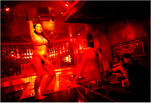 Strippers and dancers of the popular night scene in Nepal. Located mostly in the tourist area Thamel, hundreds of clubs host both local and tourists to strip shows, dances, and drinks. Each club has on average 30 to 40 girls working for them. The girls work as waiters, dancers, and strippers and in many cases as prostitutes. The clubs open at six pm everyday and close at two am.