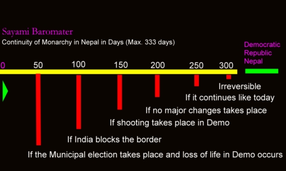 Yes, the countdown for the end of Monarchy, and of course don't forget to still keep on counting down after that for the end of the bahun parties as well. The way it is going and has been, maobadhi is the only way for some fundamental change. Yes, change in this sick system that favors the elite caste called bahuns. The only way to bring peace in Nepal is to break the hegemony of bahuns!     Of course I am not saying all bahuns are bad :)