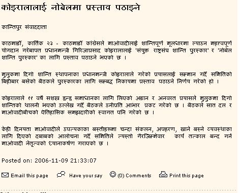 Last i checked nothing in Nepal happened without india's blessing (or i mean "involvement" to be poltically correct) to change the status quo. not sure how girija is getting all the credit?? nobel peace prize for girija = nobel peace prize for india