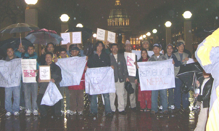 Democracy loving Nepali Diaspora in various cities of the US and other countries are organizing rallies to observe Feb 1 as a 'Black Day". In 'Nepal Democracy Google Group', we have had discussion regarding rallies at the following places, Washington DC New York San Francisco, CA Phoenix, AZ Gainesville, FL Cleveland, OH Columbia, SC London, UK Hong Kong Washington DC organized the rally yesterday. Some 200-250 people attended the rally. Slogans demanding Constituent Assembly and anti-monarchy slogans including the most popular one, "Gyane Chor, Desh Chhod", speeches and poetry recital characterized the rally. Gainesville also had the rally yesterday. About a hundred people attended it. New York will have a rally on the 1st of Feb in front of UN Headquarter (Ralph Bounch Park, 3:00 pm ). London will be organizing a rally in front of the Parliament on Feb 1. Other cities are also having rallies on Feb 1. *** *** *** Although Feb 1 is being called a "black day", the fact is that it was the brightest day in terms of opening our eyes regarding monarchy. I would call it an "eye opening day" instead. *** *** *** A picture from DC rally organized yesterday