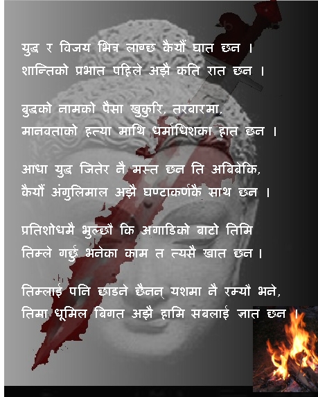 I am going to continue this trend as it proved to be pretty productive for me. Thanks for every one who supported with positive suggestions and active participation. Here is the link for previous discussions: http://www.sajha.com/sajha/html/openThread.cfm?forum=2&ThreadID=22595 Lets make it more fun. To begin with, here is one UNDER CONSTRUCTION मुट्ठी भरकालाई देशै लुटाएर दङ्गा-दङ्गी बनाईदै छ ! छाती भन्दा उठेका करोडौं करङ्गलाई सारङ्गी बनाईदै छ ! (पाखा लगाई फूल्ने गुरांसलाई, नफुल्ने पलांस सिङ्गारिदै छ) OR मरेको बाघको छाला ओढ्नेबाट ह्वास्स गन्ध आयो ब्वांसोको, चोरेर डाँफेको प्वांखहरु, कागलाई नौरङ्गी बनाईदै छ ! बन्दूक, बिल्ला, बुटको भरमा, कानूनलाई हुकुमले काट्दै छ मन, मष्तिष्क जित्न नसक्दा, शासनको रुप जङ्गी बनाईदै छ ! कस्को मोह नहोला? आशक्त को नहोला सुख:-समृद्दीको ? तर गरिबीलाई दुर्भाग्य जबरजस्ति सङ्गी बनाईदै छ ! प्रजाले दिनहुँ लाउने पोशाकमा प्वालका प्रकार अनेक, कहिले कांहि लाइने मुकुट भने, रङ्गी-चङ्गी बनाईदै छ !