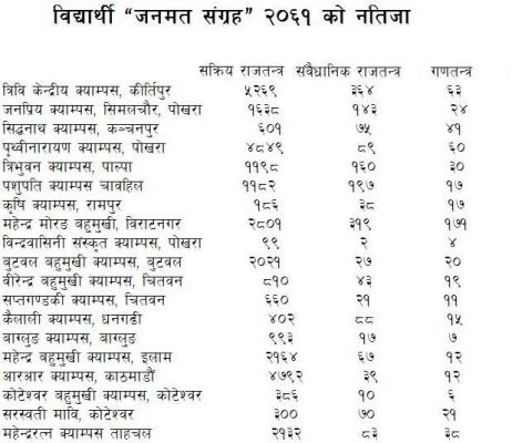 Nepe and Usofa dude Lets get realistic here. These students whoever might have had expressed their opinion in whichever side it might be, the present reality is that the monarchy is not going anywhere or not going to get scared in any way unless it is opposed by Armed Forces of similar strength. Even after 10 years from now Ganendra wouldn't buzz at all to those polls and opinions because he knows that these opinions of people dont fight with guns but the Maoists do.