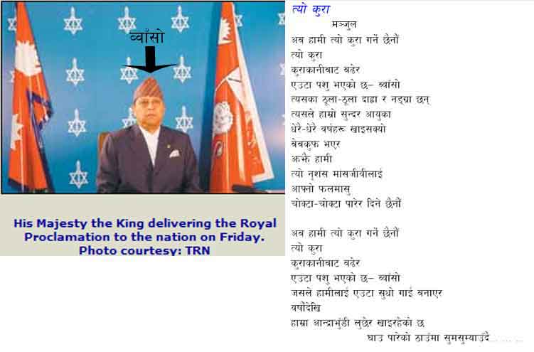 अब भन्‍नुहोला राजालाई यी कुनै पनि मान्‍य हुनेछैन। नमाने नमानुन। मन नलागी नलागी नासो त जनतालाई फर्काईदिन वाध्‍य भएपछि नमानी भो र? जनताको बल पाएका अन्‍तरिम सरकारले जनचाहना बमोजिम प्रस्‍ताव पारित गर्दा जनता साथ रहनेछन। यो बेला सविधानको यो धारा र त्‍यो धारा भन्‍नमा विवाद खडा नगरेर यो बिशाल आन्‍दोलनले ल्‍याएको जनचाहना बमोजिम कार्य गरने।