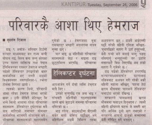 may the sousl of all 24 who lost lives in the chopper crash rest in peace! i happen to know hem rajbhandari very closely and dearly in the last few years and hereby appeal to whoever concerned, especially SEBS, NTV, friend circles to provide whatever support they can to his bereaved family and help them to pass through this difficult time. i also hope that SEBS will facilitate the coordination and explore what additional support can be provided to his family. may his soul rest in peace!!!