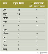 आ-आफ्नै रोडम्याप राज्य पुनःसंरचनाका बारेमा राजनीतिक दल र नागरिक समाजको अवधारणा आउन थालेको छ तिलक पाठक लोकतन्त्रको स्थापनासँगै राज्यको पुनःसंरचनाको बहसले तीव्रता पाएको छ । यही बहस चलिरहेको स्थितिमा विभिन्न जातीय संस्थाहरूले आ-आफ्नै किसिमको प्रस्ताव अघि सारेका छन् । सबैले आ-आफ् नो हिस्सा दाबी गररिहेका छन् । तर, यो दाबीमा वस् तुगत आधार र यथार्थभन्दा पनि अन्याय, असन्तोष र पीडाको प्रतिक्रिया बढी देखिन्छ । नेकपा -मालेमा) का पालिटब्युरो सदस्य सीताराम तामाङचाहिँ समाज धेरै समयदेखि शोषित भएकाले असन्तुष्टि राख्नु स्वाभाविक भएको बताउँछन् । "बार्गेनिङ् गर्यो भने मात्रै सही पाउन सकिन्छ, ठाउँ पाइन्छ भन्ने भावनाले काम गरेको छ," तामाङ भन्छन्, "राज्यले सही तथ्याङ्क पत्ता लगाएपछि यस् ता मनोगत कुराहरू हराएर जान्छन् ।" नेपालको जनगणना ०५८ मा विभिन्न जात र यसबाहेकका जनजाति समूह गरी सयभन्दा बढी समूहको विवरण छ । जातीय, भाषिक र सांस्कृतिक हिसाबले विविधात्मक देश भएकाले पनि नेपालमा ३५ लाखभन्दा बढी जनसङ्ख्या भएको क्षेत्रीदेखि केवल एक सय ६४ सङ्ख्या भएको कुसुन्डासम्म बसोवास गर्छन् । त्यसैले गर्दा पनि कुनै एउटै जाति, जनजाति वा भाषिक समूह बहुमतमा छैन । सङ्ख्यात्मक हिसाबले सबैभन्दा ठूलो समूहमा पर्ने क्षेत्री १५.८० प्रतिशत छन् भने त्यसपछिको ठूलो समूह बाहुन १२.७४ प्रतिशत मात्रै छन् । यीबाहेक मगर, थारु, तमाङ र नेवार जातिचाहिँ पाँच प्रतिशतभित्र पर्छन् । कुल जनसङ्ख्याको एक प्रतिशतसम्म भाग ओगट्ने जनजाति त १८ वटा छन् । बाँकी अरू सबै एक प्रतिशतभन्दा कम सङ्ख्यामा छन् । जिल्लागत स्थिति पनि उस्तै छ । अधिकांश जिल्लामा कुनै पनि जात, जनजातिको बहुमत छैन । ७५ जिल्लामध्ये क्षेत्री नौवटामा र मगर, थारु, तामाङ, नेवार र गुरुङ एक/एकवटामा गरी जम्मा १४ जिल्लामा मात्र कुनै एक जात, जनजातिको पूर्ण बहुमत रहेको देखिन्छ -हेर्नुस्, बक्स) । ९२ भाषाभाषी रहेको मुलुकमा भाषिक हिसाबले पनि कुनै एक समुदाय बहुमतमा छैन । त्यसैले पनि नेपालको जाति, जनजातिको बनोट मिश्रति किसिमको छ । जातीय र भाषिक विविधताले गर्दा पनि सबैको प्रतिनिधित्व गर्नका लागि सङ्घीय संरचनामा जानुपर्छ भन्ने आवाज उठिरहेको छ । तर, सङ्घीय संरचनाको आधार क्षेत्रीय, जातीय, भाषिक वा प्रशासनिक के हुने र त्यसमा कतिवटा सङ्घीय एकाइहरू हुने भन्ने विषयमा एकाधबाहेक धेरै प्रस्तावकहरू प्रस्ट छैनन् । पार्टीगत हिसाबले नेपाल सद्भावना पार्टी -आनन्दीदेवी) र नेकपा माओवादीले मात्रै सङ्घीय स्वरूप तोकेका छन् । भौगोलिक क्षेत्रका हिसाबले पाँच प्रान्त बनाउने र हिन्दीलाई नेपाली भाषासरह सम्पर्क भाषाको दर्जा दिनेदेखि राज्यका विभिन्न तहमा मधेसी समुदायका लागि ५० प्