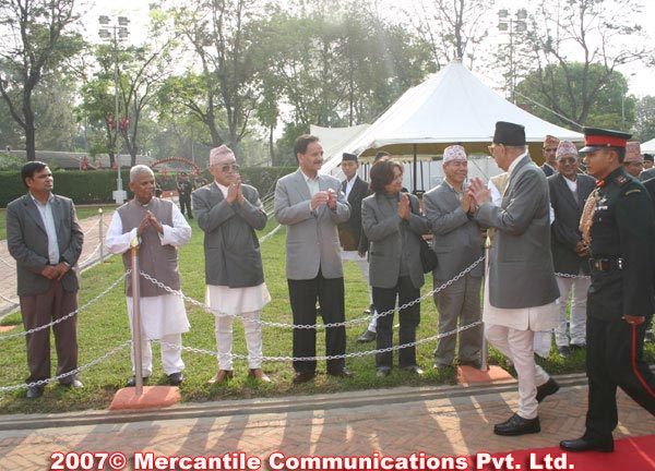 PM administers oath to ministers and state ministers; 22 member cabinet unveiled Newly appointed Prime Minister Girija Prasad Koirala taking oath of office and secrecy after his reappointment at the parliament on Sunday, Apr 01 07. Nepalnews.com/rh Prime Minister Girija Prasad Koirala administered oath of office and secrecy to the members of interim cabinet as well as state ministers. At a brief function held at the hall at National Planning Commission Secretariat in Singhdurbar, PM Koirala administered oath of office and secrecy, separately, to the cabinet ministers and state ministers. Altogether there are 16 cabinet-rank ministers and five state ministers. The cabinet ministers, as per their pecking order, include: Ram Chandra Poudel (NC), Sahana Pradhan (UML), Krishna Bahadur Mahara (Maoists), Pradeep Nepal (UML), Mahantha Thakur (NC), Dr. Ram Sharan Mahat (NC), Narendra Bikram Nemwang (NC-D), Krishna Prasad Sitaula (NC), Dev Gurung (Maoists), Rajendra Mahato (NSP-A), Prithvi Subba Gurung (UML), Matrika Yadav (Maoists), Chhabi Lal Biswokarma (UML), Hisila Yami (Maoists), Jagat Bogati (ULF) and Khadga Bahadur Biswokarma (Maoists). Likewise, five state ministers Ramesh Lekhak (NC-D), Gyanendra Bahadur Karki (NC-D), Ram Chandra Yadav, Indra Bahadur Gurung (NC) and Mahendra Singh Rathore (UML) were also administered oath of office. Following the oath-taking function, the first meeting of the interim cabinet is underway in Singhdurbar. nepalnews.com sd Apr 01 07