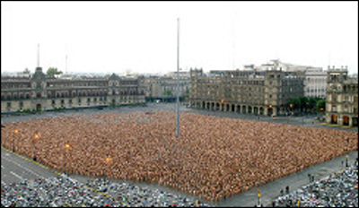 . A record 18,000 people took off their clothes to pose for U.S. photographic artist Spencer Tunick on Sunday in Mexico City's Zocalo square, the heart of the ancient Aztec empire. Tunick, who has raised eyebrows by staging mass nude photo shoots in cities from Dusseldorf, Germany, to Caracas, smashed his previous record of 7,000 volunteers set in 2003 in Barcelona, Spain .