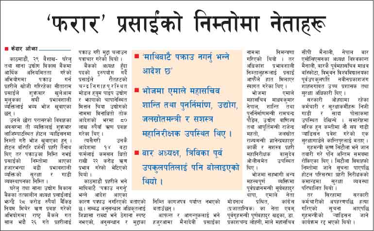 ँफरार’ प्रर्साईंको निम्तोमा नेताहरू केदार ओझा काठमाडौं, वैशाख २९ - घरेलु तथा साना उद्योग विकास बैंकमा आर्थिक अनियमितता गरेको अभियोगमा पक्राउ गर्न प्रहरीले खोजी गरिरहेका सीताराम प्रर्साईंले शुक्रबार खुलेआम मुलुकका सयौं प्रभावशाली व्यक्तिलाई भव्य भोज खुवाएका छन् । उनले छोरा परासरको विवाहका अवसरमा ती व्यक्तिलाई शुक्रबार लाजिम्पाटस्थित होटल र्याडिसनमा निम्तो गरी भोज खुवाएका हुन् । होटल वरिपरि दर्जनौं प्रहरी तैनाथ थिए तर पक्राउका निम्ति नभई प्रर्साईंको निम्तोमा आएका हजारभन्दा बढी प्रभावशाली व्यक्तिको सुरक्षा र गाडी व्यवस्थापनका निम्ति । घरेलु तथा साना उद्योग विकास बैंकका तत्कालीन अध्यक्ष प्रर्साईंलाई झन्डै २८ करोड रुपैया“ बैंकिङ नियम मिचेर ऋण प्रवाह गरेको अभियोगमा राष्ट्र बैंकले गत साल भदौ २६ गते प्रहरीलाई पक्राउ गरी मुद्दा चलाउन पत्राचार गरेको थियो । बैंकको अध्यक्ष हु“दा पदको दुरुपयोग गर्दै प्रर्साईंले रौतहटको चन्द्रनिगाहपुरस्थित मोडल ह्युम पाइप उद्योग र झापाको चापानेस्थित मित्तल चिया उद्योगको नाममा बिनाधितो तोक आदेशको भरमा ८० लाख रुपैया“ ऋण प्रवाह गरेका थिए । त्यसैगरी उनकै आदेशमा १४ वटा र्फमलाई कमसल धितो राखी २२ करोड ऋण प्रभाव गरेको भेटिएको थियो । काठमाडौं प्रहरीले भने माथिबाटै 'पक्राउ नगर्नू' भन्ने आदेश आएका कारण पक्राउ नगरिएको बताएको छ । सम्बद्ध अनुसन्धान अधिकृतलाई जिज्ञासा राख्दा भने ठेगाना स्पष्ट नभएको, अनुसन्धान र मुद्दाका निम्ति कागजपत्र पर्याप्त नभएको बताउ“छन् । आफन्त र आगन्तुकलाई भने हजुरआमा मैनादेवी प्रर्साईंका नाममा निमन्त्रणा गरिएको थियो । तर अधिकांश प्रभावशाली निम्तालुहरूलाई प्रर्साईं आफैंले हात मिलाएर स्वागत गरेका थिए । भोजमा एमाले महासचिव माधवकुमार नेपाल, शान्ति तथा पुनर्निर्माणमन्त्री रामचन्द्र पौडेल, उद्योग वाणिज्य तथा आपर्ूर्तिमन्त्री राजेन्द्र महतो, जलस्रोत राज्यमन्त्री ज्ञानेन्द्रबहादुर कार्की र सशस्त्र प्रहरी महानिरीक्ष्ँक वासुदेव ओलीसमेत उपस्थित थिए । भोजमा सहभागी अन्य महत्त्वपर्ूण्ा व्यक्तिमा पर्ूवप्रधानमन्त्री र्सर्ूयबहादुर थापा, एमाले नेता मोदनाथ प्रश्रति, कांग्रेस -प्रजातान्त्रिक) का नेता एवम् पर्ूवगृहमन्त्री पर्ूण्ाबहादुर खड्का, डा. प्रकाशचन्द्र लोहनी, माले महासचिव सीपी मैनाली, नेपाल बार एसोसिएसनका अध्यक्ष विश्वकान्त मैनाली, बारकै पर्ूवमहासचिव माधव बा“स्कोटा, त्रिभुवन विश्वविद्यालयका पर्ूवउपकुलपति नवीनप्रकाशजंग शाहलगायत उच्च प्रशासक तथा सुरक्षा अधिकारी थिए । सरकारी ओहदामा रहेका कर्मचारी र सुरक्षाकर्मीहरू निजी गाडी र सादा पोसाकमा उपस्थित देखिन्थे । समारोहमा सर