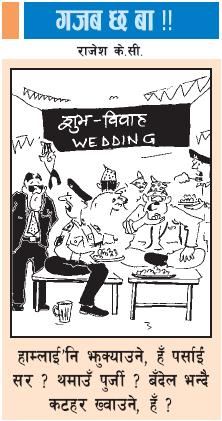 फरार अभियुक्तको पार्टीमा एमाले महासचिवदेखी सशस्त्रका आइजिपिसम्म प्रहरी पक्राउ पुर्जी जारी गर्छ अनी पक्राउ गर्न नसकेको बताउँदै अभियुक्तलाई फरार सुचिमा राख्छ अभियुक्त काठमाडौंकै एक भब्य होटलमा भोजको आयोजना गरी देशका वरिष्ठ नेतादेखी शुरक्षा अङ्गका प्रमुखसम्म मन्त्रीदेखी कानुनको ठेक्का लिएको बार एसोसिएसनका अध्यक्षसम्मलाई आमन्त्रण गर्छन् र त्यो विवाह भोजमा उनीहरु देखिन्छन् । यस्तो दुर्लभ दृष्य अन्य देशमा देखिन्छ देखिँदैन तर नेपालमा भने शुक्रवार यस्तै देखियो नै । फरार ब्यक्ति हुन् प्रहरीको पक्राउ सुचिमा रहेका सिताराम प्रसाई अनी उनका पाहुनाहरु हुन् नेकपा एमालेका महासचिव माधवकुमार नेपाल शान्ति मन्त्री तथा नेपाली कांग्रेसका महामन्त्री रामचन्द्र पौडेल बाणिज्य मन्त्री राजेन्द्र महतो जलस्रोत राज्यमन्त्री ज्ञानेन्द्रबहादुर कार्की सशस्त्र प्रहरीका आइजीपी वासुदेव ओलि राष्ट्रिय जनशक्ति पार्टीका अध्यक्ष सुर्यबहादुर थापा एमाले नेता मोदनाथ प्राश्रितशाही गृहमन्त्री कमल थापा माले महासचिव सिपि मैनाली अनी नेपाल वार एसोसिएसनका अध्यक्ष विश्वकान्त मैनाली । तपाइलाई लाग्ला भोजस्थल कुनै गोप्यस्थल होला जहाँ प्रहरी पुगेनन् भन्ने तर हैन भोजस्थल हो लाजिम्पाटस्थीत होटल र्याडिसन । अब तपाइ नै भन्नोस् यो नेपाल कस्तो हो र यहाँका नेताहरु कस्ता हुन् । राज्यले अपराधी घोषणा गरी पक्राउ वारेन्ट जारी गरेका अपराधीको पार्टीका धकै नमानी नेताहरु सहभागि हुन्छन् । सनसनीपुर्ण यो समाचार प्रकाशित गर्ने नयाँ पत्रिकाका अनुसार प्रसाई घरेलु तथा साना विकास बैंकका तत्कालीन अध्यक्ष हुँदा २८ करोड ठगि गरेको प्रमाणित गर्दै नेपाल राष्ट्र बैंकले वित्तिय अपराधि घोषणा गरेका ब्यक्ति हुन् । उनी राजाको सकि्रय शासनकालका सहयोगि हुन् । उनको घरमा शाही उपाध्यक्ष तुल्सी गिरी बसेका थिए । उनलाई पक्राउ गर्न प्रहरीले उपत्यका सहित पुर्वााचल मध्यमाचल र पश्चिमााचल क्षत्रिय प्रहरी कार्यालयलाई पत्र पठाएको थियो । तर उनी पक्राउ परेका छैनन् । प्रहरी भन्छ खोजि गरिरहेका छौं तर फेला पर्न सकेको छैन । कस्तो मजाक प्रहरी संयन्त्रको अनी कानुनको । भोजस्थलको शुरक्षाको लागि एक डफ्फा प्रहरी परिचालित थिए । पक्राउ गर्न हैन भोजमा आउने ब्यक्तिको शुरक्षा गर्न । तर प्रहरीले मात्र के गर्ने उनको भोजमा आउने ब्यक्तिहरुको सुचिले नै उनको पहुँच कुन स्तरसम्म रहेछ भन्ने प्रष्ट भएको छ नै । अब प्रहरीले मात्र के गर्ने । तर अब प्रसाईको भोजमा जाने नेताहरुले यसको उत्तर भने दिनुनै पर्छ । सुर्यबहादृुर थापा कमल थापा जस्ता नैतिकहिन नेताका लागि त के प्रश्न गर्नु । तर शान्तिमन्त्री रामचन्द्र पौडेल एमाले महासचिव माधवक