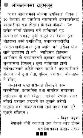 प्रहरीले पक्राउ गर्न खोजेको ब्यक्तिले अयोजना गरेको भोज कार्यक्रममा मुलुकक नेताहरु देखि सुरक्षा निकायका प्रमुख हरु पनि सामेल भएछन।नेताहरुको यस्तै साथले गर्दा भ्रस्टचारी, ठगहरु, अपराधिहरुले खुलेआम आफ्नो धन्दा गर्ने शाहस गरेकाहुन। बाहिर जनताको मन जित्न भ्रामक भासन दिने अनि बेलुकि बसेर तिनै जनताका शत्रुहरुसित साठगाठ गर्ने नेताहरु बात अब के आशा गर्ने। बाहिर गणतन्त्रको ठुलाठुला गफ गर्ने तर ब्यवहारमा तिनै राजतन्त्रका हिमायति सङग मित्रता बढाउने। बाहिर भ्रस्टाचारको कुर्लेर बिरोध गर्ने तर ब्यवहारमा तिनै भ्रस्टाचारी सित अङगालो हालेर हिड्ने अनि उनिहरुले दिएको सुबिधा उपयोग गर्ने। पक्राउ गर्ने प्रहरीले ठेगना अस्पष्ठ भएको भनेछन। तेति ठुलो भोज हुदा पनि थाहा नपाउने प्रहरीले अरु के पो थाहा पाउला? कुरो तेस्तो नभै नेताहरुको साथ नै हो भन्न सकिन्छ। ग्रिह मन्त्रिको सुरक्षाको लागि पहिलेनै पुगेका प्रहरीले सो कार्यक्रमको आयोजक थाहा नपाउने कुरै हुदैनथ्यो। बरिश्ठ नेताहरु अनि आफ्ना हाकिम पनि भएको भोज बाट कसरी सिताराम प्रसाई लाई पक्राउ गर्न सक्थ्यो प्रहरीले? बरु पक्राउ नगर्ने आदेश छ भनेछन त्यो चाहि साचो हो भन्न सकिन्छ। पक्राउ गर्न खोजिएका ब्यक्तिलाई पक्राउ गर्न नभै उनि अनि उनको आमन्त्रणमा आएका पाउनाको सुरक्षाको लागि प्रहरी तैनाथ गरिएछ। यो भन्दा लाजमर्दो अरु केहि हुन सक्क्ष? ऐन भनेको साना गरिब लाई मात्रै हो भन्ने कुरा यस्ले पनि पुस्टि गर्छ। सानालाई ऐन-ठुलालाई चैन भन्ने उखानै छ। आर्थिक अनियमितता अनि भ्रस्टाचार गर्नेलाई सामजिक सम्मान दिने हो भने कसरी समाजबाट भ्रस्टाचार घट्न सक्छ? भ्रस्टाचारीलाई त सामाजिक रुपमा बहिस्कार गर्नु पर्छ। तेहाजाने नेता, अन्य ठुला ठालुले भन्लान हामित सिताराम को नभै उन्को छोराको बिहेमा पो गएका हौ। अनि भन्लान यो ब्यक्तिगत मामिला हो। यो सबै बहाना मात्रै हो। खास कुरोत उनिहरुको पनि भ्रस्टाचारि सित सङलग्नता छ र इनैको सहयोगबाट भ्रस्टाचार मौलाइ रहेको च। अनित भ्रस्टाचारिले सानका साथ घुमिरहेका छन।अनि समाजमा उनिहरुकै मान सम्मान बढी छ।