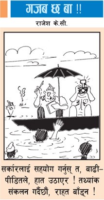 अविरल वर्षाले डुबानमा परेको दुई सातापछि सरकारका दुई मन्त्रीले आइतबार उद्धार र राहतको स्थिति बुझ्न बाँके र बर्दियाको भ्रमण गरेका छन् । भ्रमणका लागि उनीहरूले छुट्टाछुट्टै हेलिकप्टर प्रयोग गरे । स्वास्थ्यमन्त्री गिरिराजमणि पोख्रेल बिहानै फिस्टेल एयरको हेलिकप्टरबाट नेपालगन्ज आइपुगेका थिए । उनी भेरी अञ्चल अस्पताल निरीक्षण गरेर बाढीग्रस्त क्षेत्रको भ्रमणमा निस्केको दुई घन्टापछि गृहमन्त्री कृष्णप्रसाद सिटौला सेनाको हेलिकप्टरमा आएका हुन् । भ्रमणमा उनीसँगै बाँके र बर्दियाका एक दर्जनभन्दा बढी सांसदसमेत थिए । 'म छुट्टै कार्यक्रममा आएको हुँ,' स्वास्थ्यमन्त्री पोखरेलले भने- 'गृहमन्त्री आउने कुरा मैले यहीँ आएर थाहा पाएँ । उनी स्वास्थ्य अधिकारीसहित बाढीग्रस्त क्षेत्रको भ्रमणमा छन् । बाढी प्रभावित क्षेत्रमा सरकारी स्थलगत निरीक्षण ढिलो भएको स्विकार्दै उनले भने- संयोजन हुन सकेन । भइदिएको भए राम्रो हुन्थ्यो ।' एउटै हेलिकप्टरबाट आउन सक्नेमा दुइटा प्रयोग गर्दा यातायात खर्च भने दोब्बर भएको छ । दुवै मन्त्रीको टोलीले बाढीग्रस्त गाउँमा पीडितलाई भने कुनै सहयोग गरेन । गृहमन्त्री सिटौलाले भने दोहोरो खर्चलाई दुरुपयोग भन्न नमिल्ने बताए । उनले सञ्चारकर्मीहरूसँग भने- 'यो दुरुपयोग होइन । स्वास्थ्य टोलीलाई प्राथमिकता दिइएको हो ।' बाँकेमा बाढीले ६ हजार ९ सय ८० परिवार प्रभावित भएका छन् । ५ सय ५१ घर भत्केका छन् भने १ हजार ३ सय ५० घर स्थानान्तरण गर्नुपर्ने अवस्थामा रहेको प्रमुख जिल्ला अधिकारी नरेन्द्रराज शर्माले बताए । यसैबीच गृहमन्त्रीसँगै आएका विधायकहरूले दक्षिणपूर्वी बाँकेको डुबान समस्या समाधान गर्न भारतद्वारा सीमा क्षेत्रमा निर्मित लक्ष्मणपुर बाँध र कलकलवा तटबन्ध भत्काउन सरकारले स्पष्ट नीति लिनुपर्ने बताएका छन् । दैवी प्रकोप उद्धार समितिका तर्फबाट टोलीलाई डुबानबारे जानकारी गराएपछि विधायकहरूले डुबान समस्याको स्थायी समाधानका लागि लक्ष्मणपुर बाँध र तटबन्ध भत्काउनुको विकल्प नभएको बताए । 'बाँकेको डुबान समस्या मानव निर्मित हो । सरकारले बाँध भत्काउने अडान लिनैपर्छ,' एमाले नेता वामदेव गौतमले भने- 'भारतले नभत्काए अन्तर्राष्ट्रिय अदालत जानुपर्छ ।' उनले बाँध तथा तटबन्धले पुगेको क्षतिपूर्तिसमेत भारतले दिनुपर्ने बताउँदै त्यस्तो मागमा भारतीय जनताले समेत साथ दिने विश्वास व्यक्त गरे । माओवादी नेतृ पूणर्ा सुवेदीले गौतमको भनाइमा सहमति जनाइन् । कांग्रेस उपसभापति कोइरालाले परराष्ट्र मन्त्रालयमार्फत सरकारले गम्भीरतासाथ डुबान समस्याबारे कुरा उठाउनुपर्ने बताए ।