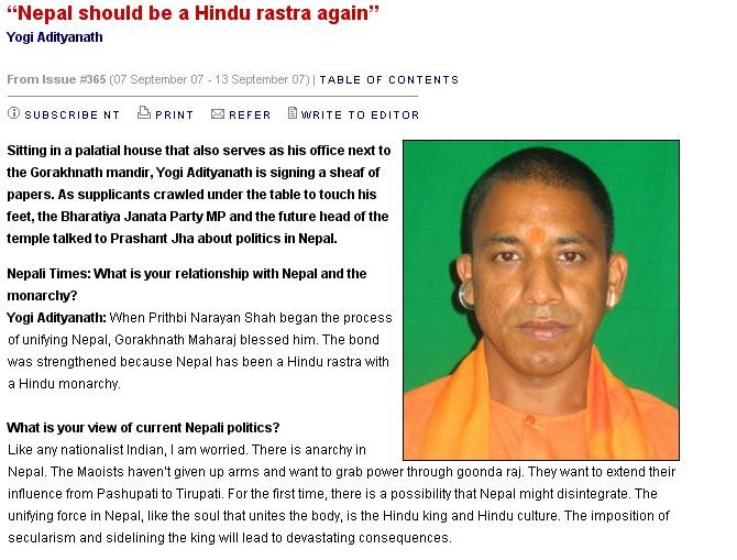 I agree with Yogi Adiatyanath that the King serves as the unifying force in Nepal. It is good that the elected people in office get to finalize the King now (if the Monarcial system remains in the future). It is very crucial to have a King in a country like ours, which will serve as the symbol of unity. If the political parties are left to control Nepal, there will be many more Maoists, Terai armies, YCLs, and such other organizations desrupting peace and stability. If the political parties remove the monarcial institution now, we might realize somewhere in the future that it was the wrong decision. Nepal might be second Afganistan, where the King was outsed and then came the radial Taliban. Everyone should get a share in the country's democracy!
