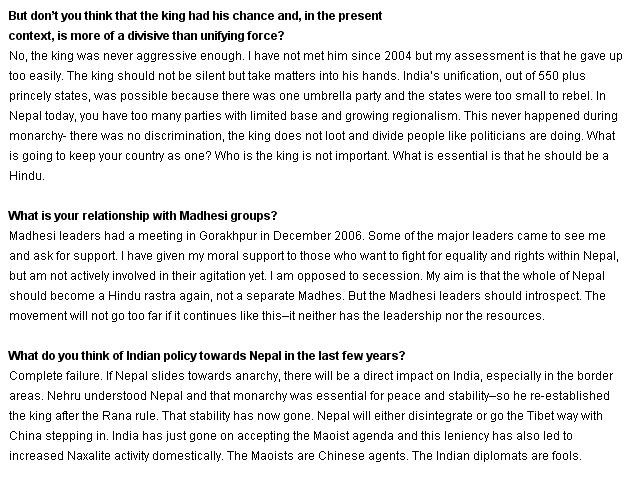 I don't know about the "Hindu Rastra" bit but but as per the Yogi, the King is definitely a unifying force rather than one who "Divides people like the politicians are doing." At least we have one man who is in Nepali soil calling the Maoists what their path of irrationality really is :"Goonda raj". Its about time the politicains find their balls and do the same!!