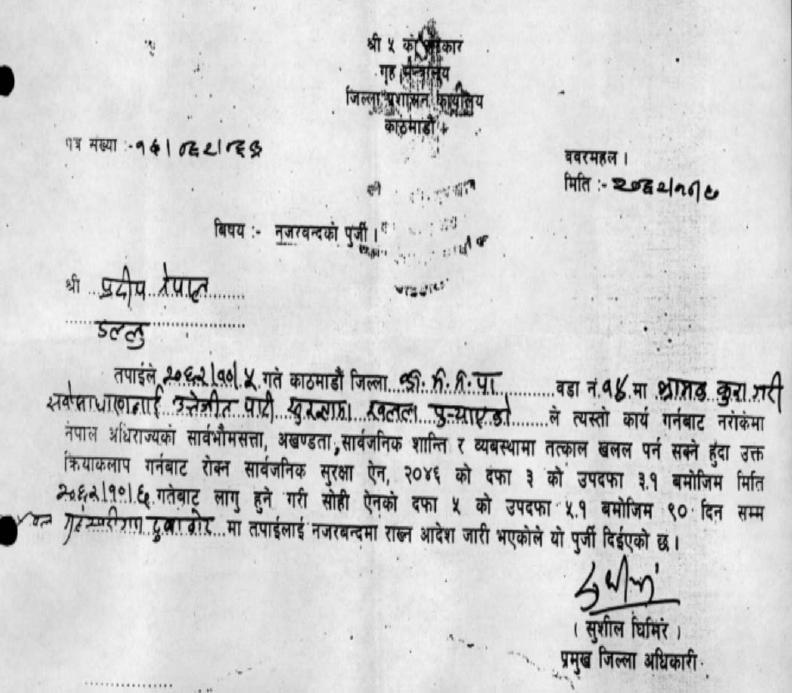 .   .   End of Autocracy..   This is the begining of end of Autocracy in Nepal.   Time has come to countdown the left-over days.   I think there is only maximum 333 days left to find a safe passage to escape from this situation.     Today is the second day of 333 days left.     Count down 332     History of all dictatorship in the past in this world shows, at last they all send the letters like this to the democratic leaders. Because they cannot do anything else in this vaccum flask.     Recently Opposition leaders from orange revolution in Ukaraine got letters from the last government with almost the same content.   It�w worth fighting. Democracy wins at last.    Let�s start demos also in overseas to help our friends in our home country.