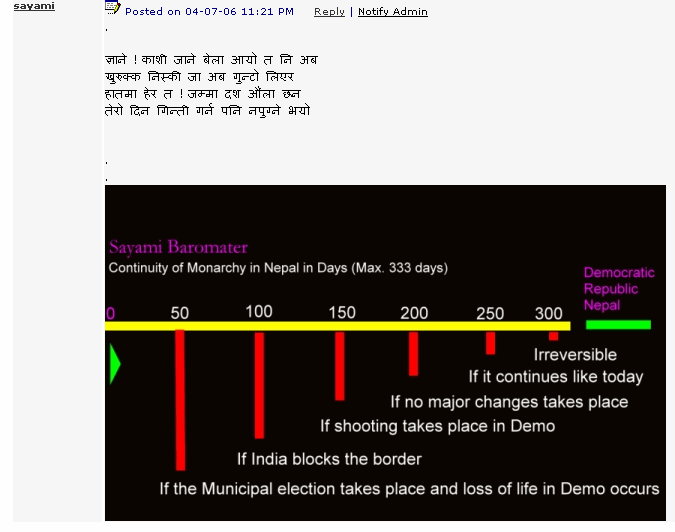 .   I started this thread Jan 19 2006 Countdown Autocracy in 333 days.   It is exactly an year ago almost there. It needed 34 more days.   Anyway Monarchy has come to an end.     आज गोराखनाथको १२ पुस्ते आशिर्बाद पुरा ।